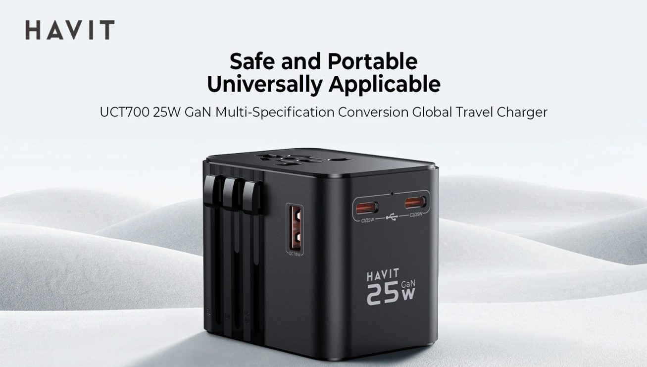 El cargador de viaje Havit UCT700 es compacto, ofrece carga rápida de hasta 25W, incluye 2 puertos USB-C y 1 USB-A, y está diseñado para adaptarse a voltajes globales (100–240V), ideal para viajes