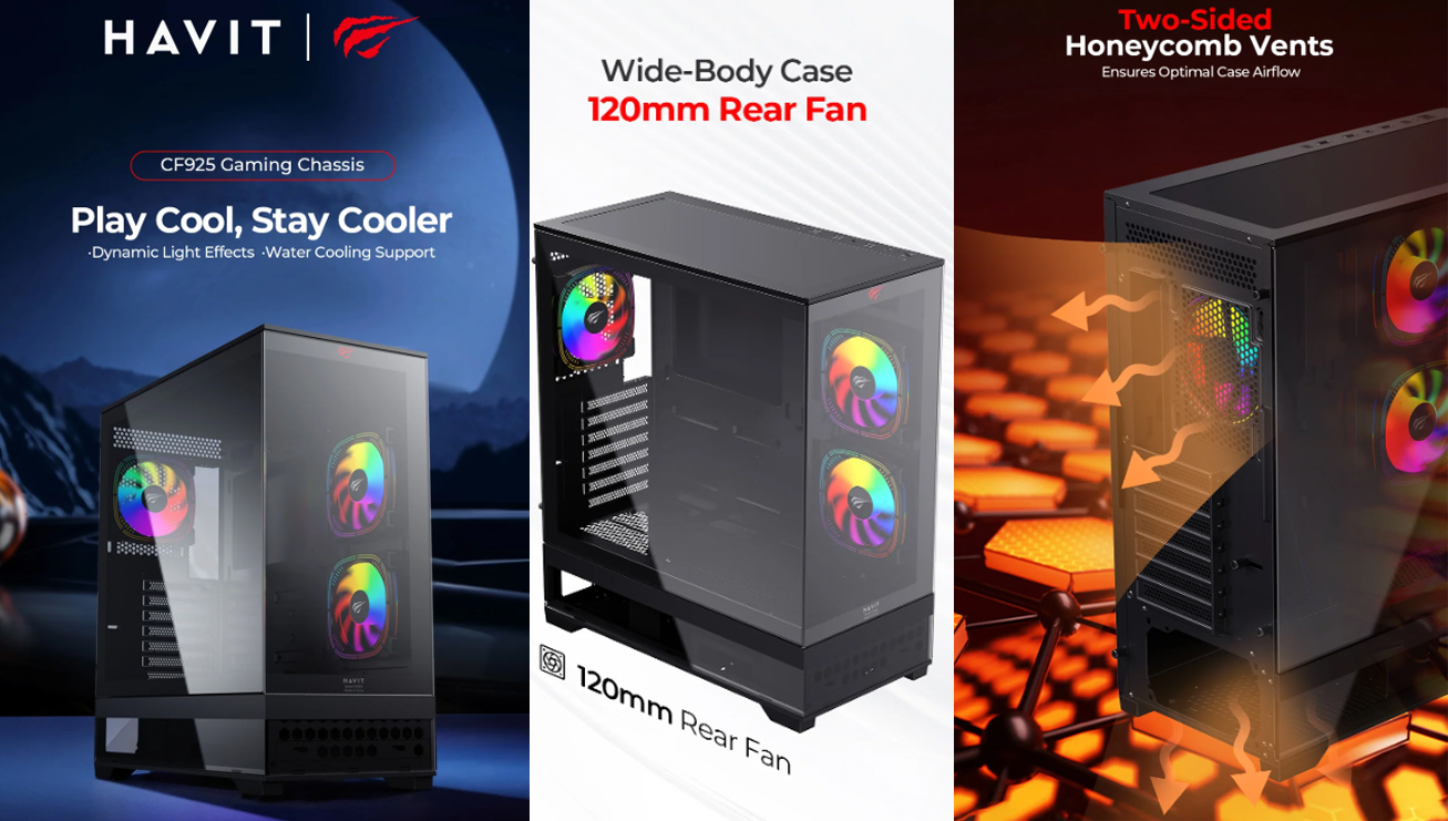 La Havit CF925 es una caja de PC diseñada para gamers, con un diseño elegante y un panel lateral de vidrio templado